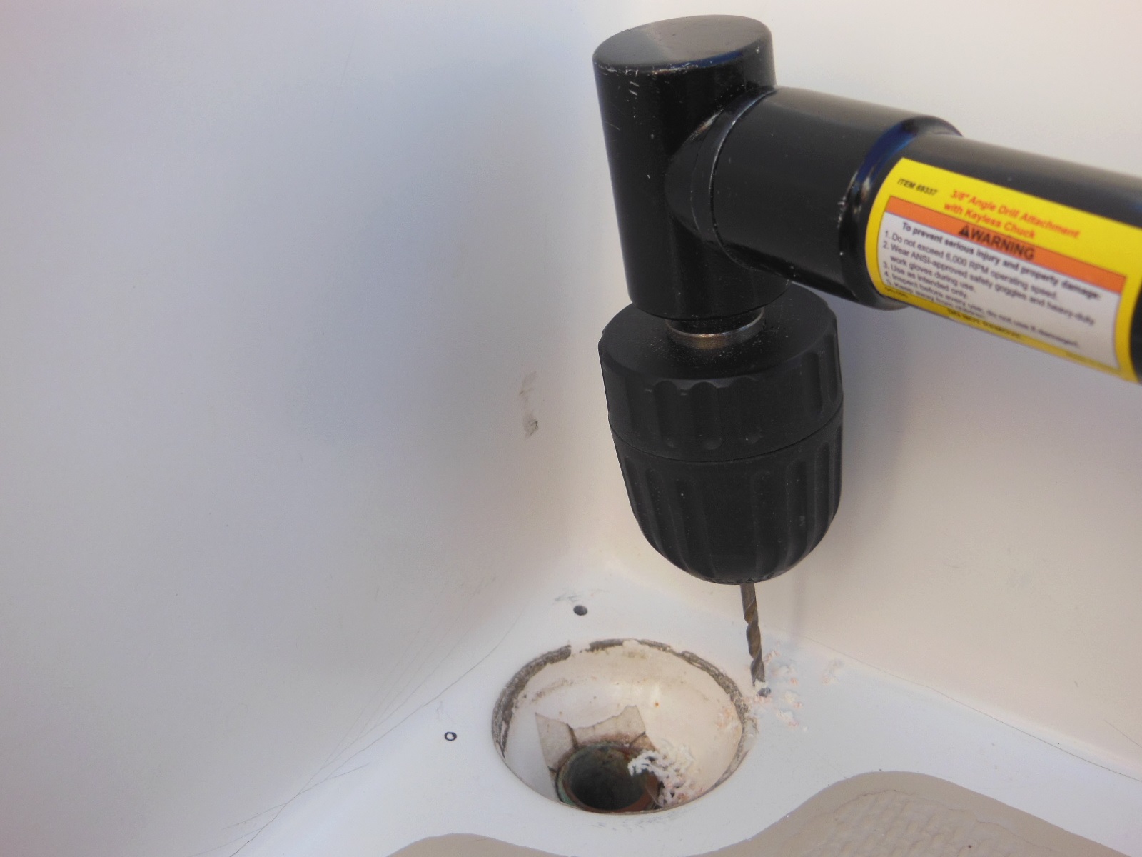 14. Use your countersink bit or a larger drill bit to chamfer the edges of the holes to twice their diameter, about 1/4″ in this case. Relieving the gelcoat edges prevents them from cracking when you drive in the screws.