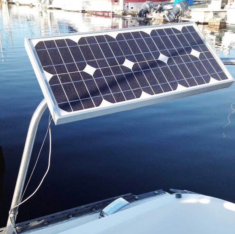 [$tingy note: If you don’t have a suitable mounting location for a solar panel but you have an outboard motor with generator coils, another option is to Upgrade Your Outboard Motor to Charge Your Battery.]