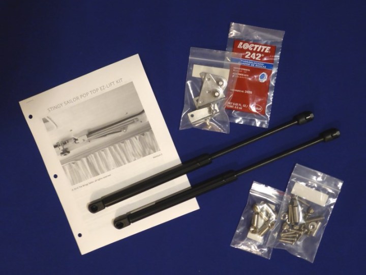 The kit comes with all the parts and fasteners you need to install two high-pressure gas springs to do most of the lifting, one on each side of the pop top. All of the parts are high quality and made for a lifetime of use.