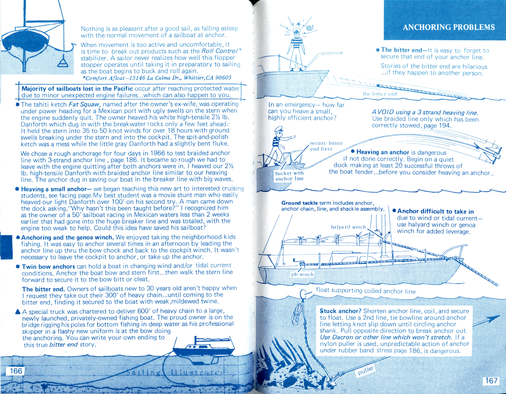 Along the left side of the back cover is an index to the sections of the book that are marked with tabs printed in the outer margins. Need to remember how to jibe a spinnaker? Just open the book to the corresponding tab and there it is presented in a way that you can absorb in a minute or less. Think of it as Google with only one answer to read. Most topics are covered in one page or two facing pages, for example, anchoring problems below.