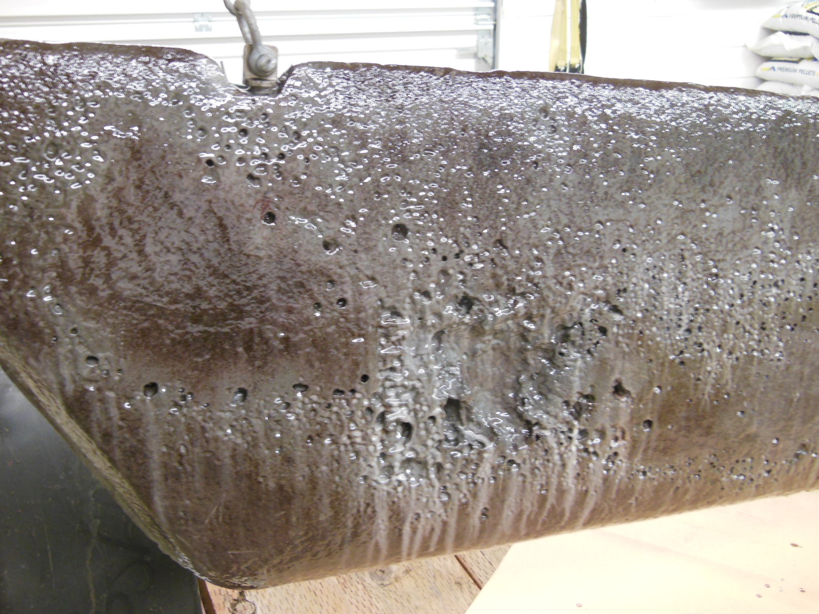 Then I lowered the keel flat onto a fork lift pallet on my utility trailer to apply a second coat to one side at a time. The reason for this was the pits in the surface. With the keel flat, I was able to fill the smaller pits (up to about 1/2″ in diameter) with epoxy. With the keel hanging, the epoxy flowed out of the pits. The starboard (worse) side took 16 pumps each of resin and hardener for the second coat. The port (better) side took 13 pumps.