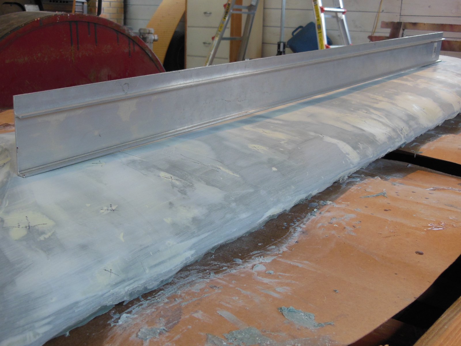 I experimented with making a 1/4″ plywood template of just the leading edge and using it to screed the filler down the length of the keel but it didn’t work very well. What did worked well was to bend a plastic spreader to the desired curve and, holding it at a low angle to the keel, pull a blob of filler down the leading edge, effectively extruding the filler to the correct shape. After it cured, I only needed to sand it a little to remove the high points and to feather the edges.