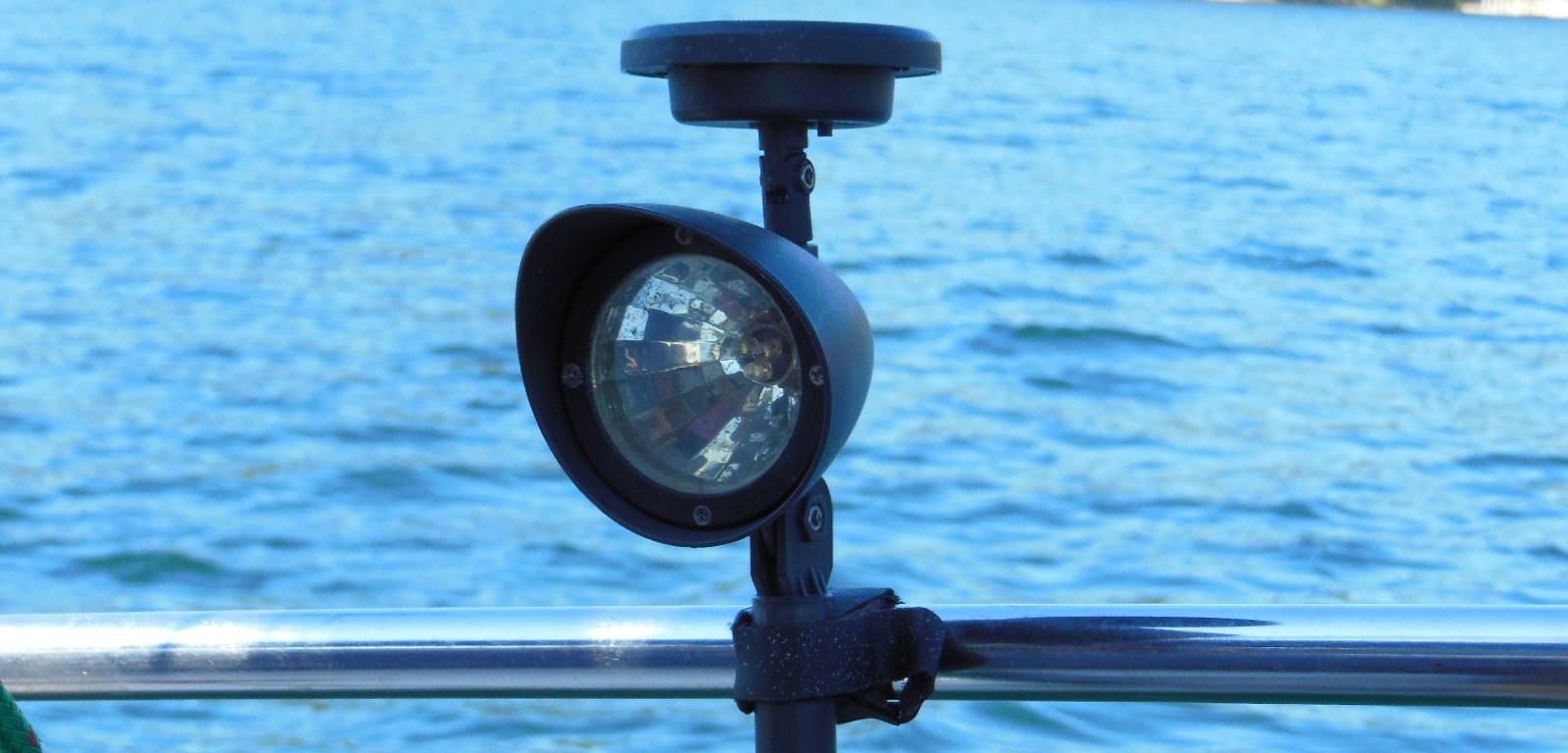 Then one day I noticed that the post of one of our solar-powered landscape floodlights was about the right size to fit in one of those flashlight mounts if I attached it to the top pushpit rail.