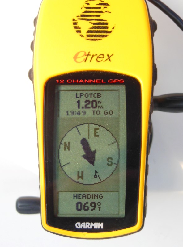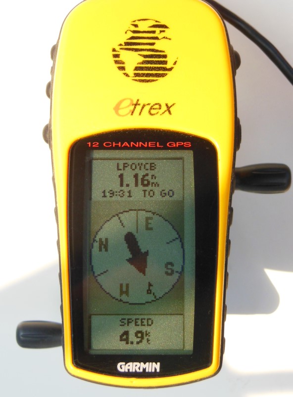 In the picture below, you can see that I’m making 4.9 knots of speed over ground. You can also see that I’m pointed almost due East (the GPS is pointed toward the bow). The waypoint labeled LPOYCB is 1.16 nautical miles away and would take 19 minutes and 31 seconds to reach at the current speed. Since the arrow is pointing almost behind me, I would have to turn around to go to the waypoint.
