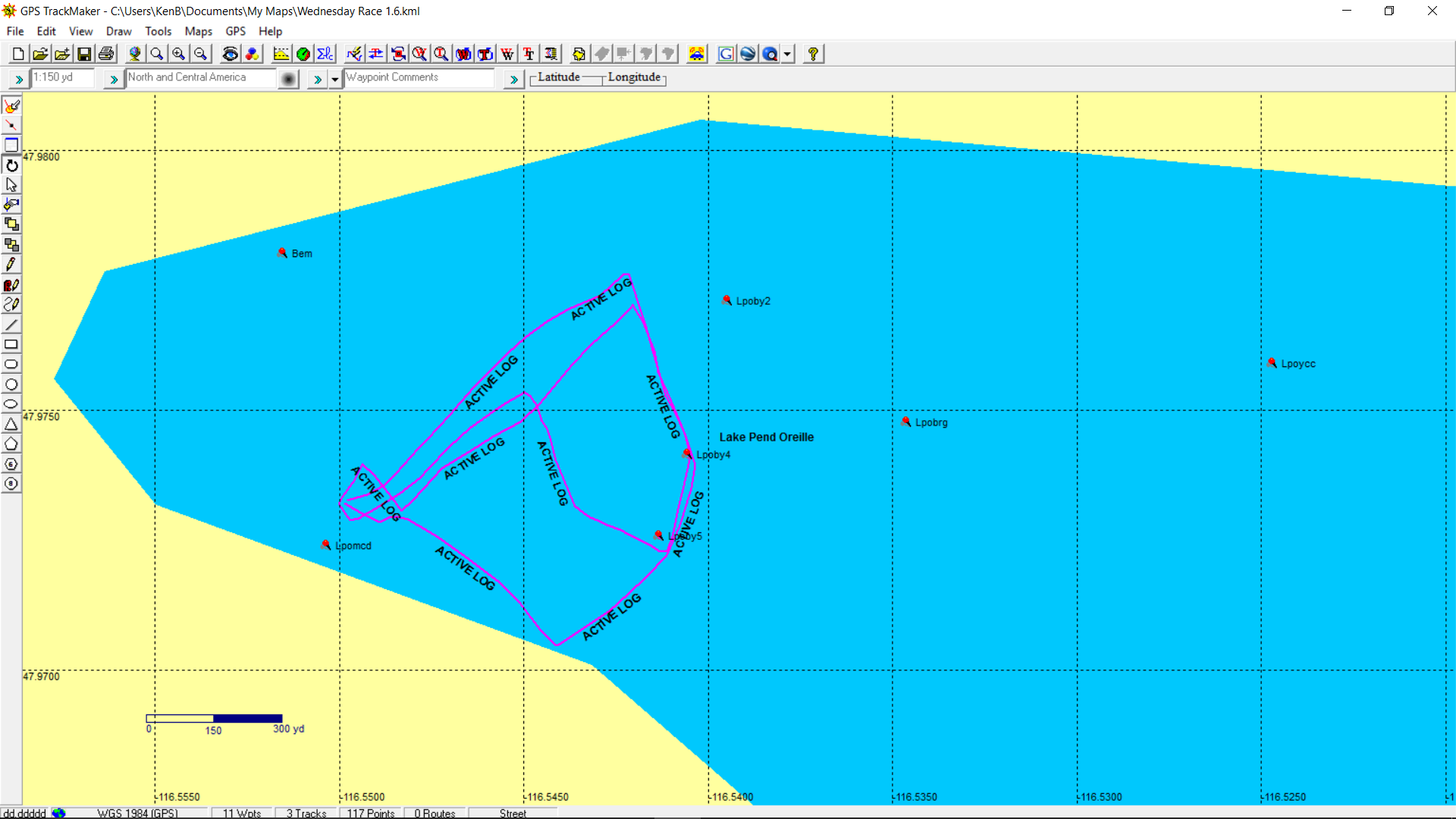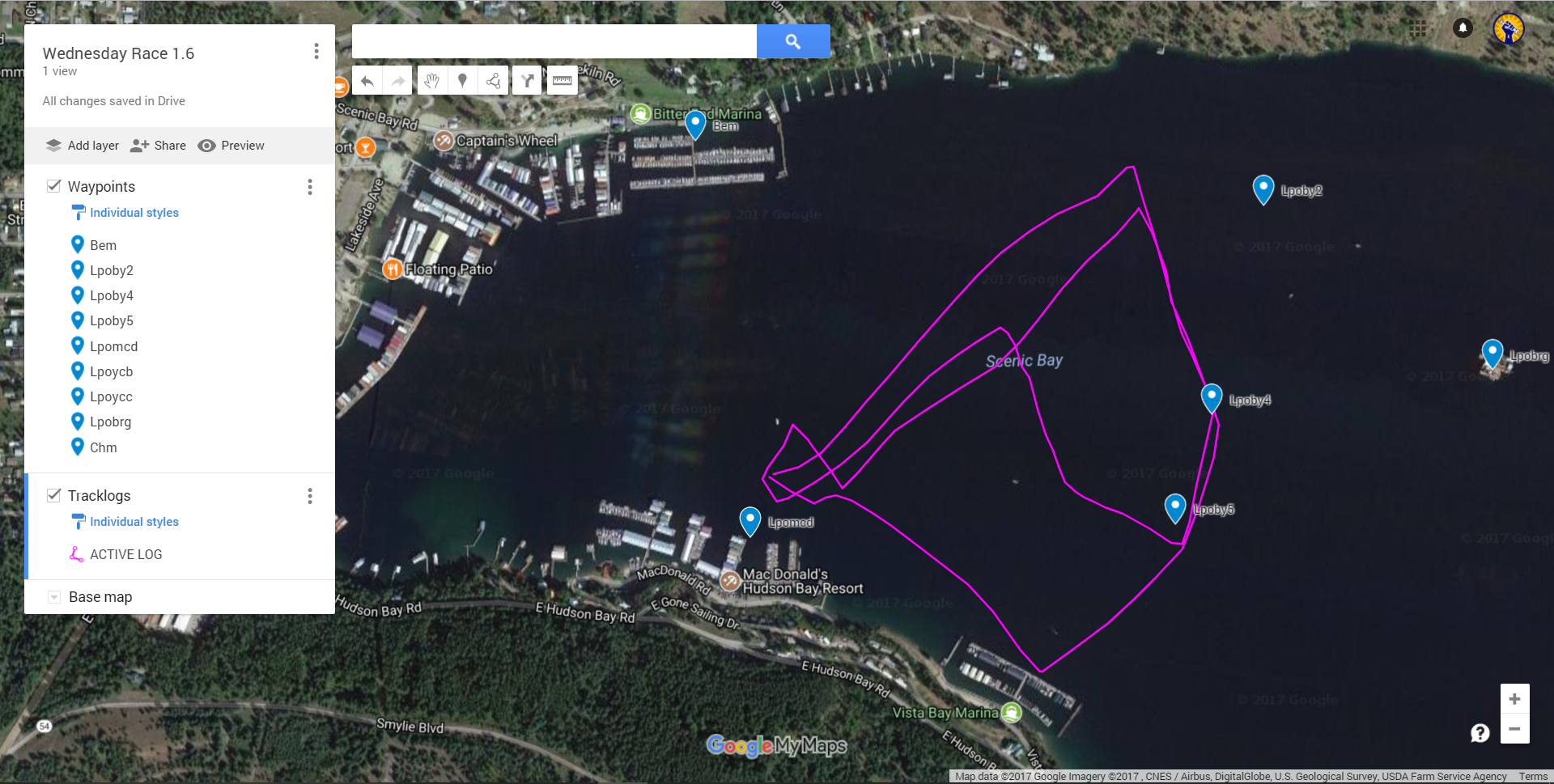 For example, the picture below shows a track from a 2 lap race. You can see that the race started and ended in the west end of the bay and rounded two marks (waypoints) counter clockwise in the middle of the bay. The wind was out of the east and you can easily see the tacks and gybes. By examining the speed of individual segments and angles, you can compare strategies to decide which is faster.