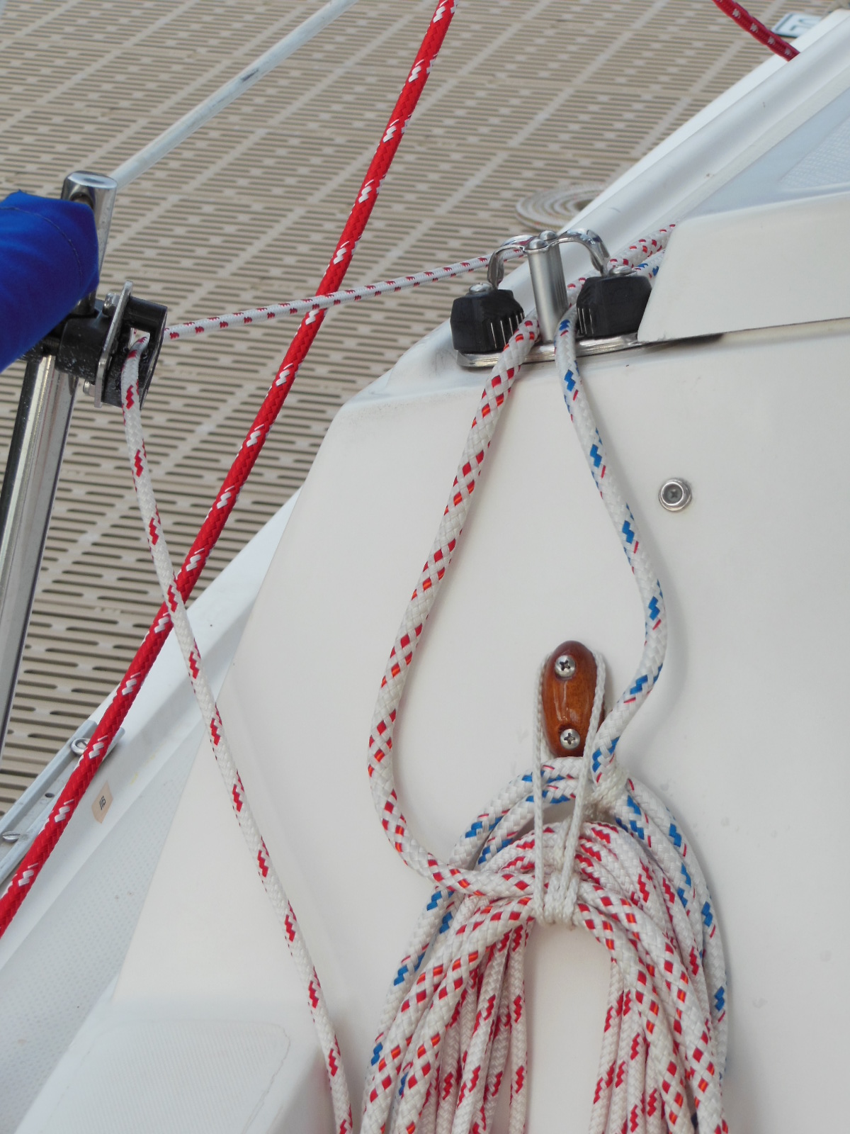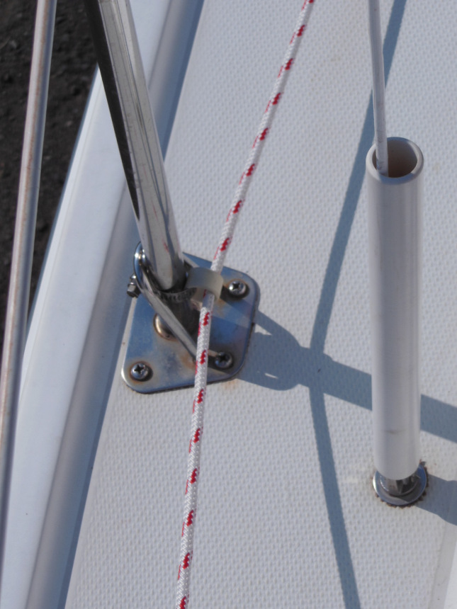 Downhaul (left) terminated in a stanchion mounted clam cleat