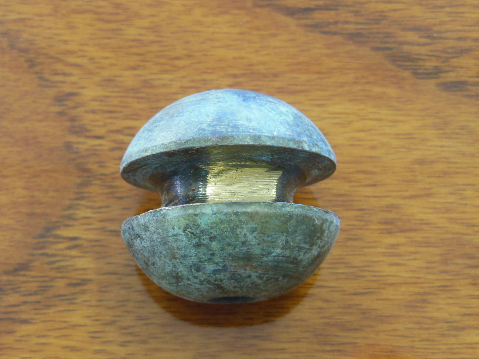 Catalina 22s and 25s with swing keels use a brass turning ball like the one shown below. The ball turns on a pin inserted into the top of the brass keel cable tube that is glassed into the hull. If the pin becomes corroded or dirty to the point where the ball cannot turn, even momentarily, the cable can cut a flat spot in the groove. If the flat spot is large enough, it alone can prevent the ball from turning and the groove will get deeper and deeper with each lowering or raising of the keel.