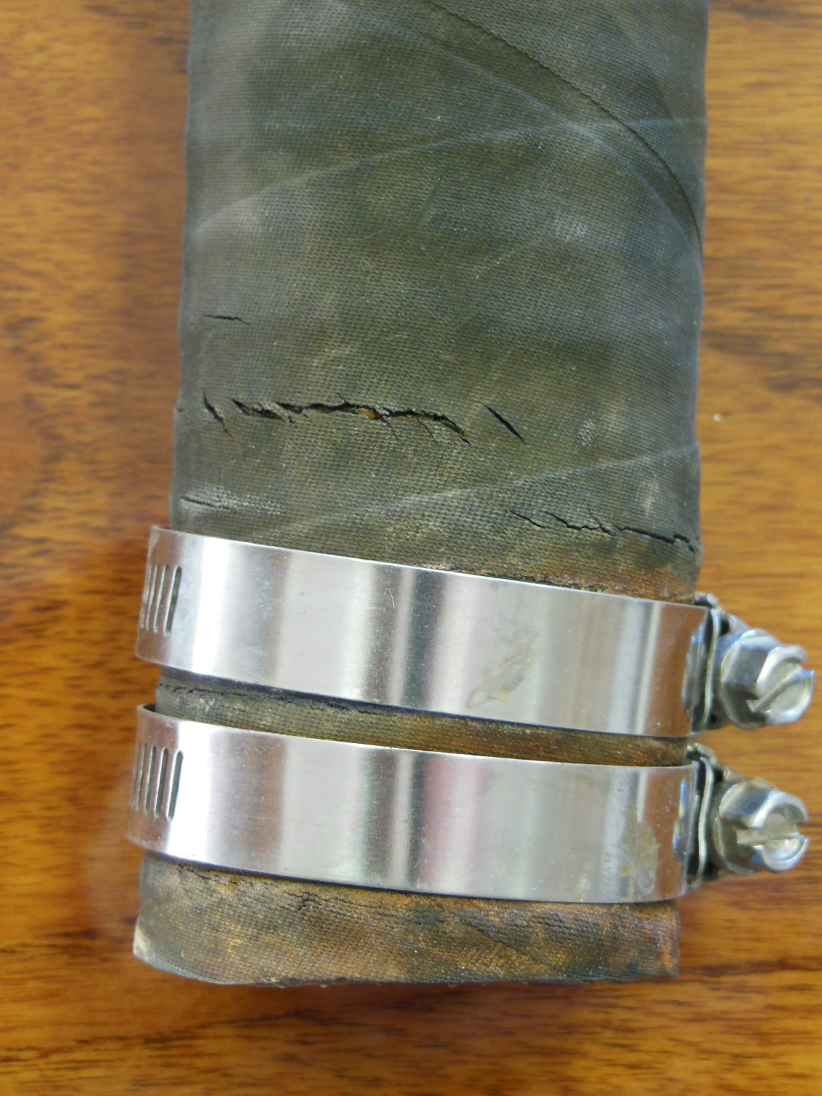 Over time, all rubber hardens and any hose can develop cracks, particularly at the point where part of the hose bends and part of it is stationary. The principle is the same as described for the keel cable above. The joint between the hose and the keel cable tube is just such a point as shown in the picture above. The smaller crack on the right in this hose went completely through the hose but you might not think so by looking at it from the outside. The larger crack on the left had not yet broke through. The point is, you cannot really tell unless you inspect it.