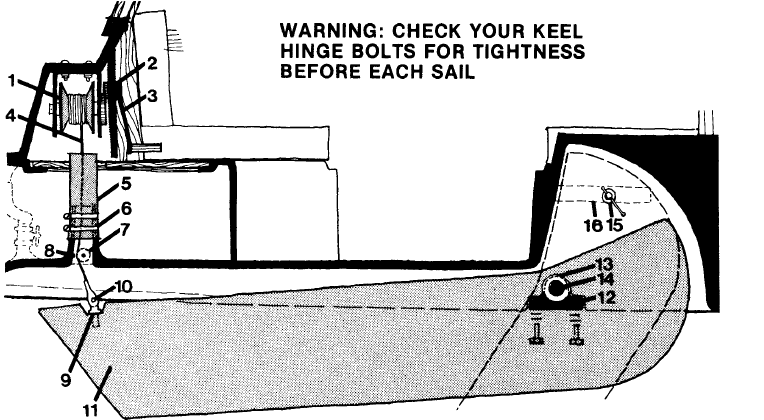 Parts of the C-22 swing keel system. Many other trailerable sailboats are similar.