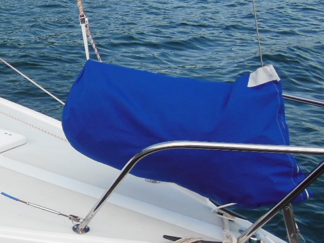 A foredeck sail bag is a canvas bag that you can close around a doused headsail that you leave attached to the forestay when you’re not under sail. It’s like the nylon sail bags that you store your sails in below deck but its made of a more durable canvas material. It also has a different opening to fit around the sail hanks when they are attached to the forestay. The canvas protects the sail from the elements and wildlife damage. Actually, you can also use it in place of a nylon sail storage bag by detaching the hanks from the forestay while the sail is in the bag, closing the bag, and stowing it below.