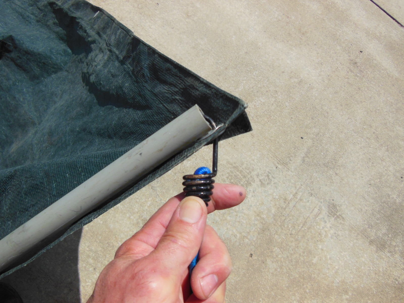 I went with thicker PVC (1″) to accomodate the extra width. I cut the PVC into thirds for easy storage and ran shock cord through them to make them like tent poles. (Although, initially I just used a 3/16″ nylon line and put a taught-line hitch at one end to take up the slack once the pieces were put together) I joined the PVC together with fittings that are slip fittings on one side and threaded on the other. (Now, that it is working, I’ll glue the slip fitting side.) I got the tarp for $10 online. It might be a little bit of overkill, but the thing worked really well and we don’t mess around with the sun around here.