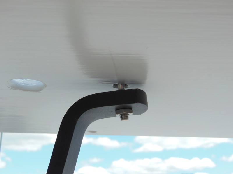 Another option is to build or buy a short folding table leg (AP Products 013-071 Folding Table Leg or similar) that you can attach to the bottom of the lid but fold up and secure so that it’s out of the way when the lid is back on the locker. Again, make the leg short enough and attach it 1″-2″ inward from the edge so that it clears the locker opening when the lid is being used as a lid instead of as a table. As a last resort, I’ve also seen tables suspended from the boom by a short accessory cord. Choose the option that works best for you.
