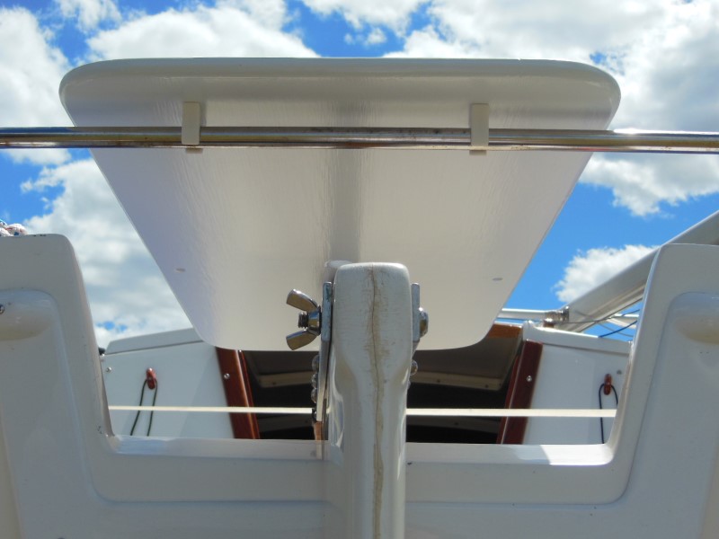 With the aft edge of the locker lid supported, you can support the front of the lid at one point with the tiller handle. The three points together make a stable base for the lid.