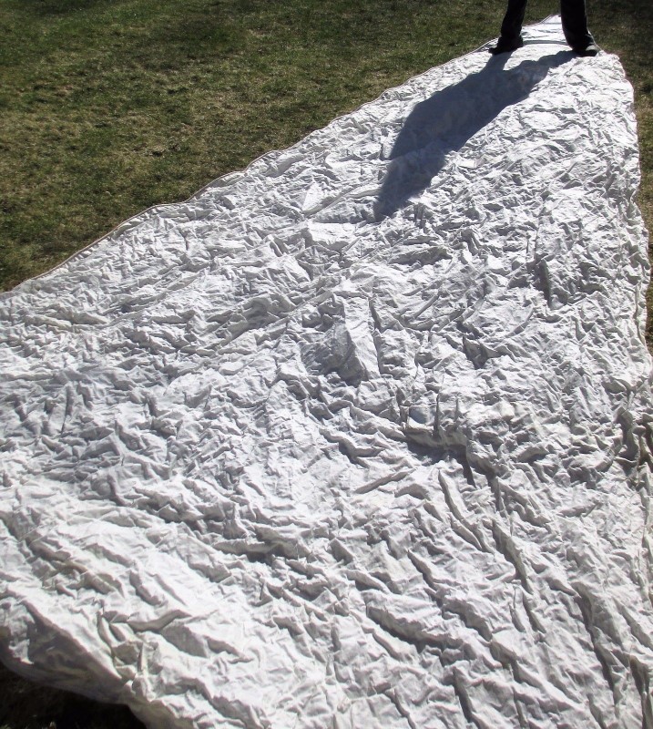 If you don’t have that much storage space or for less than crisp sails, flake the sail on the ground and then loosely roll the stack from one end to the other. Each time you do this, flake the sail a little differently and it won’t develop permanent creases. This method takes the least storage space, half the volume of a sail bag in most cases.