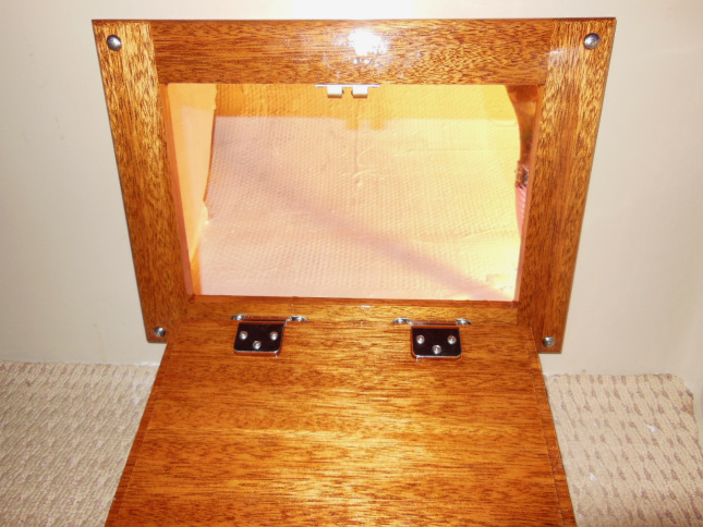 Drill through-holes in the frame for the mounting screws. Then center the frame over the opening and use the frame holes as guides to drill pilot holes through the underlying fiberglass. Screw the frame in place with stainless steel oval head wood screws and trim washers. I installed the door so that it opens downward since it is almost at floor level anyway. This puts it out of the way when getting things in and out of the storage space. It could also be oriented to open sideways or upward, your preference. Lastly, I painted the inside of the space to brighten it up and to make it easier to see what’s stored there.