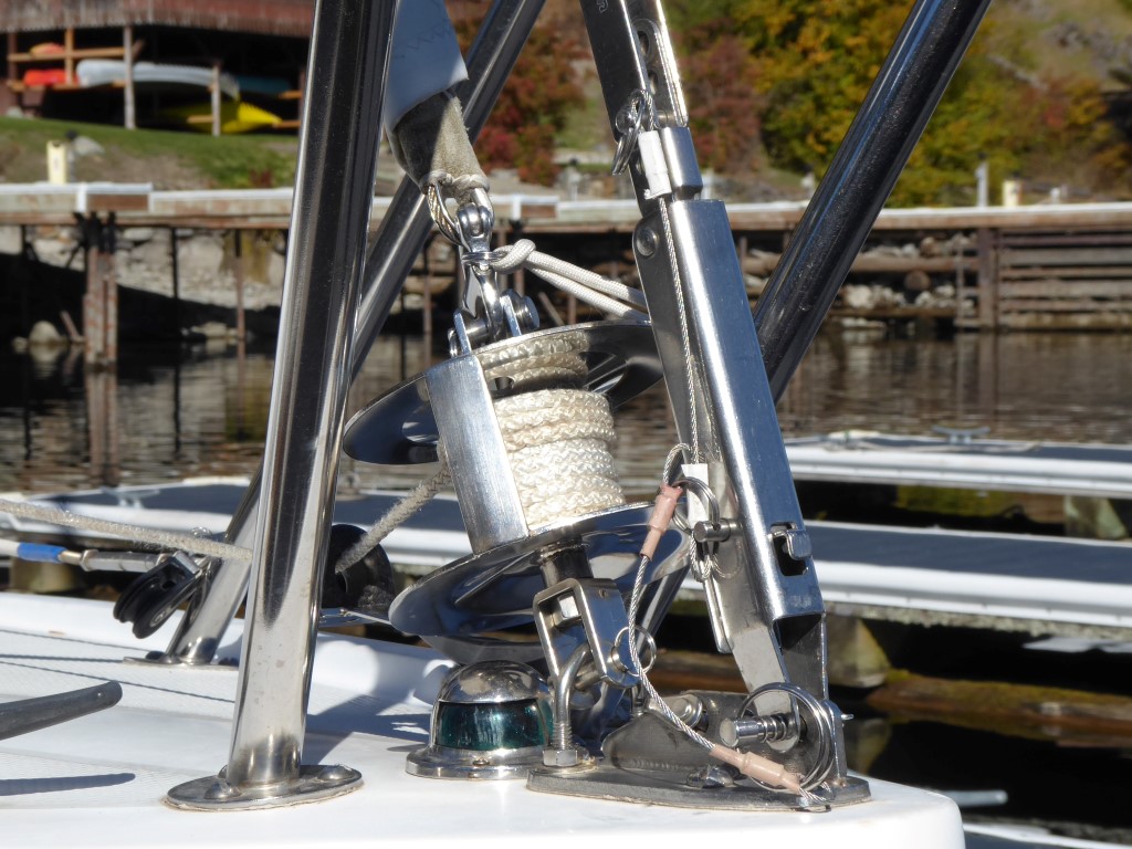 - Consider adding a pair of straight, 4″-6″ tangs below the drum to raise it a little higher above the deck and to clear nav lights or make a fairer lead aft for the furling line.