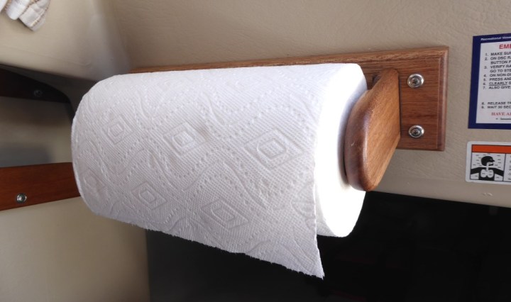 Meal preparation and cleanup, spills, and children are just a few of the reasons to have a roll of paper towels on board. But a roll can take up a lot of precious shelf space and the roll won’t stay dry for long in a locker exposed to the bilge. What’s the solution? Hang it up, skipper!